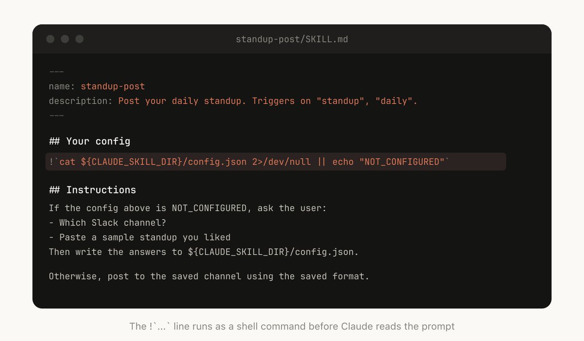某些 skill 可能需要从用户那里获取上下文才能完成初始化。比如你在做一个把 standup 发到 Slack 的 skill,就可能需要 Claude 先询问要发到哪个 Slack channel。